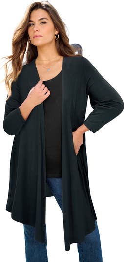 Featuring an open-front design, this flyaway cardigan is an ideal layering piece to always have on hand. Its extra length provides plenty of coverage over a tank or tee, making it great for your air-conditioned office or to use between seasons. Three-quarter sleeves.
