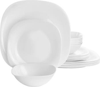 Throw an elegant party with this Gibson Ultra Piazza 18 Piece Soft Square Tempered Opal Glass Dinnerware Set. Made from gorgeous tempered opal glass, these serving platters are break and chip resistant to withstand years of entertaining. The high-fired glaze finish means these are non-porous making for super easy cleanup and are dishwasher, microwave, and freezer safe for convenient everyday use. The plain white color against the glossy finish gives these an elegant look and feel, perfect for parties, holidays, gatherings, and anything else you have planned. Serve up your favorite main courses, soups, desserts, and more with this stunning dinnerware.