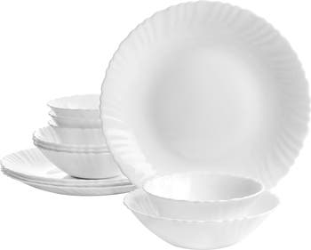 The Gibson Ultra Radley 12 piece set is simple and classic, featuring scalloped edges. This set is constructed with tempered opal glass that is stronger than regular stoneware. Internal tests show Ultra-Dura out performs other stoneware dishes by as much as 3 times in terms of impact resistance and 4 times in chip resistance. The high fired glaze creates a more hygienic, fully vitrifies surface with almost zero porosity. This set is dishwasher, microwave, and freezer safe for easy storage, clean up, and reheat. Comes with service for four.