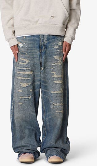 Distressed details and raw hems amplify the old-school appeal of these ultrawide-leg jeans fashioned from nonstretch denim.