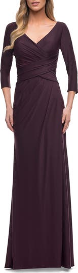 Soft jersey long dress with three quarter sleeves. V neckline and criss-cross ruched design on bodice. Back zipper closure.