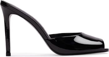 Micro peep toe mule, set on a straight stiletto heel. Made with smooth patent finished leather.