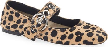 Large grommets add edge to the buckle strap of this reimagined mary-jane flat textured with a genuine calf-hair upper.
