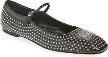 An edgy studded leather upper and slender buckle strap enrich this timeless mary jane flat fronted by a square toe.
