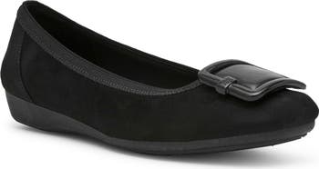 Geometric hardware adds a touch of contemporary style to a streamlined ballet flat designed for cushioned comfort and flexibility.