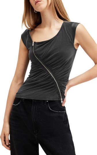 Pretty meets gritty in a delicately ruched top split by a gleaming curved zipper.