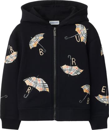 A zip hoodie in loop-back cotton, printed with hand-painted check umbrellas and the letters from our logo scattered throughout. ||Zip closure|Rib-knit trims