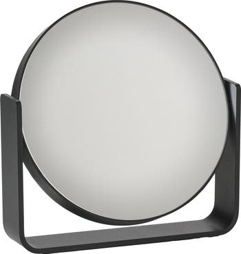 This minimalist round mirror is powder coated for a pleasant matte appearance and adds a clean, modern aesthetic to any table or countertop. One side is a normal glass mirror and rotates to the other side that has a mirror with 5x magnification.