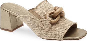 Textured burlap brings natural structure to this leather-lined open-toe mule finished with a decorative knotted vamp and a tapered block heel.