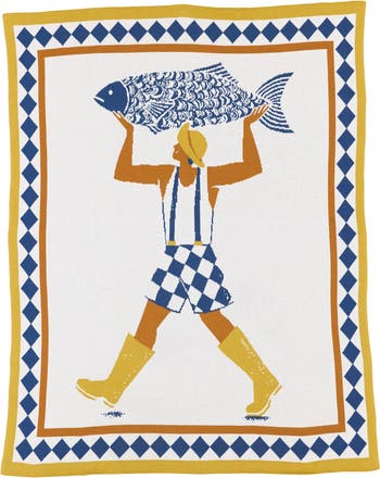 Alice Des conjures whimsical coastal energy as a fisherman reels in a poetic fish. The illustration pops with wit and simplicity, crafted in ultra-soft knit cotton. Machine wash on cold and tumble dry on low for easy care.