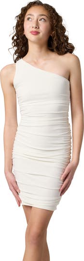 Ruched sides add delightful texture to this stretchy dress with a one-shoulder neckline.