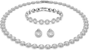 Round crystals framed by gleaming halos illuminate this perfectly polished necklace, bracelet and earrings set that delivers stunning Swarovski shine.