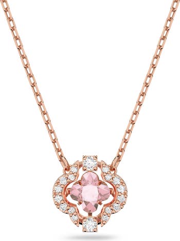A clover-shaped crystal virtually floats at the center of the pavé-set cage that defines this dancing pendant necklace.