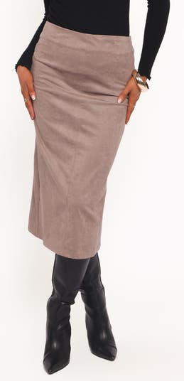 Vertical seams and a pencil-inspired silhouette bring rich structure and dimension to a stretch-enhanced midi skirt shaped from faux suede.