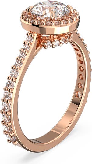 A sparkling round Swarovski crystal beams light from the center of this stunning ring with streams of pavé crystals at the sides.