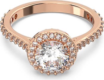 A sparkling round Swarovski crystal beams light from the center of this stunning ring with streams of pavé crystals at the sides.