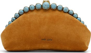 Bezel-set faux-turquoise beads trim the vintage-inspired frame of an evening-ready clutch rendered in rich suede and secured with a kiss-lock closure for timeless elegance.