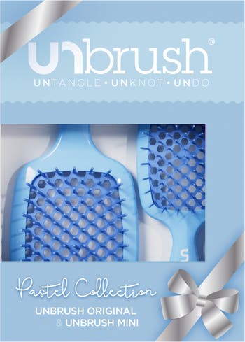 The Unbrush gift set features a full size Unbrush and a matching mini Unbrush. The Unbrush gently and thoroughly extracts knots and tangles from even the most unruly hair, painlessly, and effortlessly.