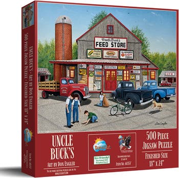 Embark on a captivating journey into the heart of rural America with Uncle Buck's - a 500 piece jigsaw puzzle by SunsOut Puzzles for adults featuring the nostalgic artwork of Don Engler. Each puzzle piece unveils a richly colored, historical American countryside farm scene. Famous for their dedication to excellence, SunsOut ensures seamless assembly with precise interlocking pieces crafted from high-quality recycled cardboard and soy-based inks, showcasing a blend of superior craftsmanship and sustainability. Uncle Buck's puzzle, proudly Made in the USA, encapsulates a commitment to local craftsmanship, customer satisfaction, and the highest manufacturing standards. With a worry-free guarantee, any issues with missing or damaged pieces are promptly addressed for a worry-free puzzle-building experience. The puzzle symbolizes eco-conscious creativity, with its vibrant, durable design crafted from recycled materials and soy-based inks, providing endless entertainment without compromising on environmental values. By choosing Uncle Buck's jigsaw puzzle, you support SunsOut Puzzles, a woman-owned small business thriving on creativity and empowerment, and join a community that values innovation, quality, and sustainability. Perfect for quiet evenings or family gatherings, Uncle Buck's 500 piece jigsaw puzzle for adults offers an ideal blend of challenge, relaxation, and artistic beauty drawing you into an engaging journey of Americana charm.
