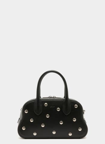Unda top handle bag in black grained leather embellished with playful round studs. The undulating lines of its silhouette are carried by two top handles or a detachable shoulder strap in matching leather.