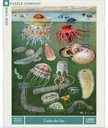 Dive into the mesmerizing world of marine life with the Under the Sea 1000 piece jigsaw puzzle. This captivating puzzle showcases a stunning vintage-style illustration of diverse sea creatures, from delicate jellyfish and vibrant cephalopods to intricate aquatic flora. The scene's rich details and bold colors bring the wonders of the deep ocean to life, making it a fascinating challenge for puzzle enthusiasts and marine biology lovers alike.\r\n\r\nFeaturing a random die-cut design, no two pieces are alike, ensuring a unique and engaging puzzle experience. Proudly made in the USA, this puzzle combines high-quality craftsmanship with an educational and artistic theme.\r\n\r\nImmerse yourself in the beauty and mystery of the underwater world as you assemble this detailed and colorful masterpiece. Perfect for nature enthusiasts, art lovers, and puzzlers of all skill levels!