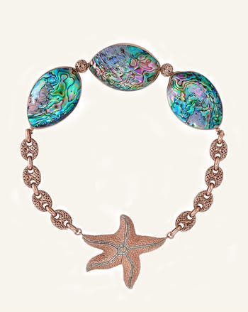The Under the Sea Necklace captures the nature of an otherworldly destination with its two-tone starfish clasp and coral-patterned chain. Featuring an abalone shell, it embodies the elegance of underwater creatures.