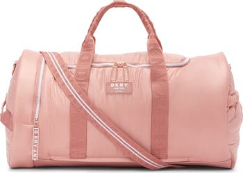 Lightweight, sporty, classy and super cute all describe the Underground Collection from DKNY. The satin polyester fabric is soft to touch but durable enough for your everyday needs. The duffel features a U shape Zipper opening that leads to a roomy interior. The top handles, removable shoulder and side grab handle offer three convenient ways to carry your duffel. The size will make it your go-to option for weekends away, the gym, yoga classes, a carry on for most major airlines, or a fashion forward diaper bag. Choose from Black or Primrose.