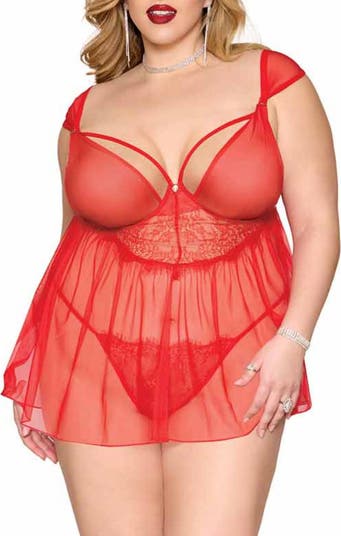 Sheer mesh and slender straps add to the allure of this underwire babydoll chemise that barely veils the coordinating G-string.