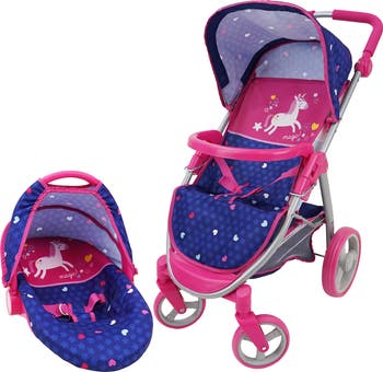 2-in-1 Doll Stroller Travel System is the perfect blend of real and fantasy mommy role-play. The Stroller includes a large shopping basket, retractable canopy, swivel front wheels, adjustable ergonomic handle, and removable car seat. The car seat is multifunctional and can be used as a carrier or a feeding chair. The magic happens when the Car Seat connects with the Stroller creating the Doll Travel System, perfect way to get around town, out to the park or traveling to your friend’s house. Free your imagination in a world full of adventure with your very own 2-in-1 Doll Travel System. For Dolls up to 18" (46 cm). **Doll not included**.