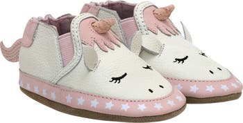 Unicorn detailing—including a 3D horn and ears—adds irresistible charm to a flexible crib shoe designed to keep baby comfy and balanced while at play.