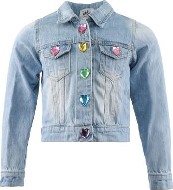Trendy denim jacket featuring dazzling heart-shaped gem buttons and a stunning sequined unicorn on the back. Perfect for adding a touch of magic and sparkle to any casual or special occasion outfit.