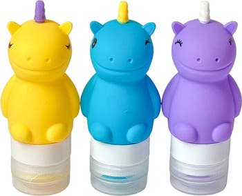 - Set of 3 unicorn-shaped bottles in Purple, Yellow, and Aqua—perfect for sauces, dressings, and dips on the go Leakproof design with flip caps and no-drip valves keeps lunch mess-free and kid-friendly Dimensions: Each bottle measures 4.5" (H) x 1.75" (W) with a 2 oz capacity—fits Yumbox Original, Panino & Tapas lunchboxes Easy to clean: Wide opening and removable cap make filling and washing a breeze; top-rack dishwasher safe Made from BPA-free, food-grade silicone—durable, reusable, and safe for everyday use