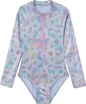 Set sail for adventure in the Unicorn Squad Long Sleeve Zip Front One Piece! This suit offers full coverage with a convenient front zipper for easy wear and sun protection. Made for comfort and durability, it offers built-in UPF protection and chlorine resistance for long-lasting wear.