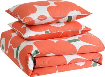 The iconic Unikko flower pattern designed by Maija Isola in 1964 covers a must-have duvet-cover set done is soft, breathable organic cotton. The set is made by Marimekko, the Finnish design company famous for joyful, splashy graphics and inventive textiles that embody the elevated everyday aesthetic of Finnish modern design.