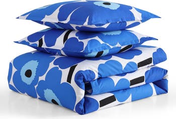 The iconic Unikko flower pattern designed by Maija Isola in 1964 covers a must-have duvet-cover set done is soft, breathable cotton percale. The set is made by Marimekko, the Finnish design company famous for joyful, splashy graphics and inventive textiles that embody the elevated everyday aesthetic of Finnish modern design.