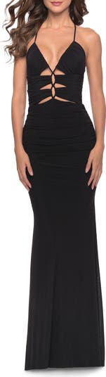 Net jersey prom dress with unique cut outs down the neckline. Open lace up back and ruching along the zipper. Back zipper closure.