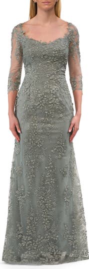 Long mother of the bride dress with unique lace applique and modified square neckline. Sheer illusion three quarter sleeves. Back zipper closure.