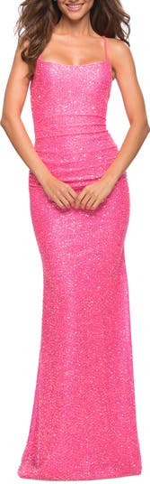 Gorgeous gown in a unique soft Iridescent sequin fabric. Modified square neckline and open lace up back. Back zipper closure.