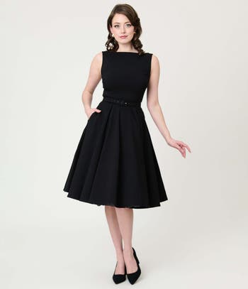 Step back into timeless elegance with the Devon Swing Dress! Crafted from sturdy stretch fabric, it features quarter sleeves, a darted bodice and a dramatic bateau neckline that transitions to a sultry V in the back. Complete with side pockets, a back zipper, and a matching belt.