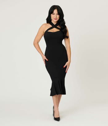 The Penelope is a striking 1950s vintage style dress, crafted in supple stretch blend that clutches curves, with a cross halter neckline princess seamed to perfection in a sassy sweetheart cut. The ravishing pencil skirt is double vented for effortless movement.