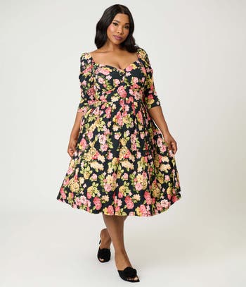 This romantic plus size 1950s inspired swing silhouette is crafted in a sturdy woven. The stunning sweetheart neckline features an adorable faux button. Outfitted with a pointed and wide waistband, three-quarter length sleeves, and a pleated knee-length skirt. Complete with a back zipper.