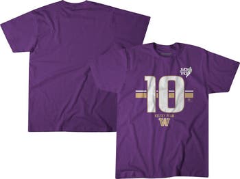 Represent a Washington Huskies basketball legend with this Kelsey Plum Name & Number Striped T-Shirt. Featuring Kelsey Plum's iconic number 10 on the back and the Washington Huskies logo on the front, you'll be able to showcase which school the WNBA champion point guard came from. Made from a durable and cozy polycotten blend, this tee will let you enjoy game days in style and comfort for years to come.