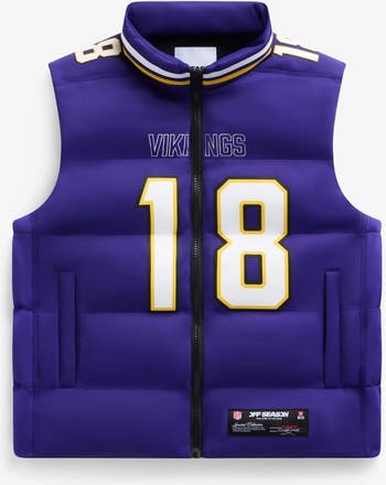 This Off Season x NFL Player Puffer Vest includes team name and logo embroidery, an NFL 3D silicone patch and hand-applied Justin Jefferson graphics on the front and back, so you can represent your favorite Minnesota Vikings player in style. Featuring corduroy lining with a padded polyester fill that provides exceptional insulation, double interior pockets and a water-resistant finish, this vest combines fashion and function to keep you warm and comfortable all game long.