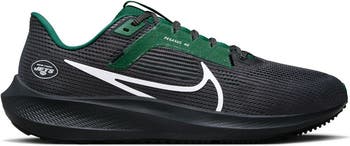With Nike React foam and a Zoom Air unit, this Zoom Pegasus 40 Running Shoe is exactly what you've been looking for to show off your New York Jets pride. The mesh upper enhances breathability, while the wider forefoot provides more room for your toes. Combining Nike's cutting edge technology and the New York Jets graphics you love, this shoe is perfect for any occasion that involves being comfortable and looking cool.