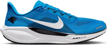 Hit the ground running with these Carolina Panthers Air Zoom Pegasus 41 Sneakers from Nike. Designed for both performance and fandom, these sneakers feature responsive cushioning thanks to the dual Air Zoom units and ReactX foam midsole, providing an energized ride for daily runs and casual wear. The improved engineered mesh upper offers enhanced breathability while reducing weight, ensuring maximum comfort, while the signature waffle-inspired rubber outsole delivers exceptional traction and flexibility. Crafted with ReactX foam, these sneakers not only enhance performance but also reduce their carbon footprint, making them a sustainable choice for the eco-conscious fan. With a heel-to-toe drop of 10 mm and weighing approximately 10.4 oz, these Pegasus 41s will have you repping your favorite NFL team with comfort and style.