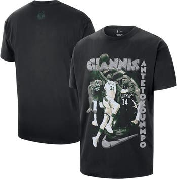 Showcase your appreciation for Giannis Antetokounmpo by sporting this Athlete T-Shirt from Nike. Its heavyweight cotton fabric featuring an eye-catching tribute to the Milwaukee Bucks superstar provides a premium look and feel. The loose fit and dropped shoulders allow for unrestricted movement, giving you roomy comfort in this Giannis Antetokounmpo shirt.