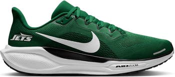 Hit the ground running with these New York Jets Air Zoom Pegasus 41 Sneakers from Nike. Designed for both performance and fandom, these sneakers feature responsive cushioning thanks to the dual Air Zoom units and ReactX foam midsole, providing an energized ride for daily runs and casual wear. The improved engineered mesh upper offers enhanced breathability while reducing weight, ensuring maximum comfort, while the signature waffle-inspired rubber outsole delivers exceptional traction and flexibility. Crafted with ReactX foam, these sneakers not only enhance performance but also reduce their carbon footprint, making them a sustainable choice for the eco-conscious fan. With a heel-to-toe drop of 10 mm and weighing approximately 10.4 oz, these Pegasus 41s will have you repping your favorite NFL team with comfort and style.