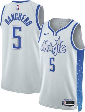 Celebrate the electrifying talent of Paolo Banchero with this Nike Orlando Magic Swingman Jersey. Inspired by the team's rich history and vibrant city, this 2025/26 jersey embodies the energy and passion Paolo Banchero brings to the court every night. Built with Nike's Dri-FIT technology, the lightweight double-knit fabric wicks away moisture, ensuring optimal comfort as you showcase your team pride. The heat-applied twill team and player details, along with the iconic Swoosh logo and satin woven jock tag, add to the authentic look and feel.