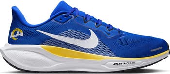 Hit the ground running with these Los Angeles Rams Zoom Pegasus 41 Running Shoes from Nike. Designed for both performance and fandom, these sneakers feature responsive cushioning thanks to the dual Air Zoom units and ReactX foam midsole, providing an energized ride for daily runs and casual wear. The improved engineered mesh upper offers enhanced breathability while reducing weight, ensuring maximum comfort, while the signature waffle-inspired rubber outsole delivers exceptional traction and flexibility. Crafted with ReactX foam, these sneakers not only enhance performance but also reduce their carbon footprint, making them a sustainable choice for the eco-conscious fan. With a heel-to-toe drop of 10 mm and weighing approximately 10.4 oz, these Pegasus 41s will have you repping your favorite NFL team with comfort and style.