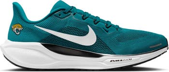 Hit the ground running with these Jacksonville Jaguars Air Zoom Pegasus 41 Sneakers from Nike. Designed for both performance and fandom, these sneakers feature responsive cushioning thanks to the dual Air Zoom units and ReactX foam midsole, providing an energized ride for daily runs and casual wear. The improved engineered mesh upper offers enhanced breathability while reducing weight, ensuring maximum comfort, while the signature waffle-inspired rubber outsole delivers exceptional traction and flexibility. Crafted with ReactX foam, these sneakers not only enhance performance but also reduce their carbon footprint, making them a sustainable choice for the eco-conscious fan. With a heel-to-toe drop of 10 mm and weighing approximately 10.4 oz, these Pegasus 41s will have you repping your favorite NFL team with comfort and style.